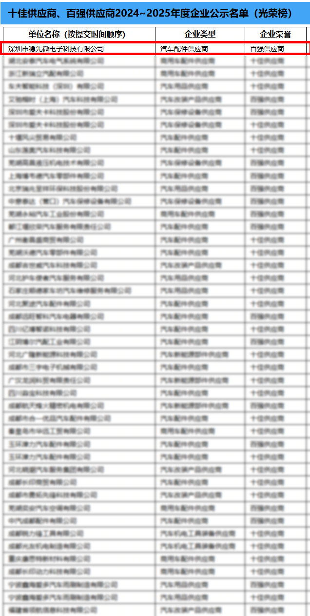 2025年4月,中國(guó)汽車(chē)供應(yīng)商網(wǎng)(China autosupplier)以“聚勢(shì) 賦能 共贏”為核心主題,并聚焦汽車(chē)后市場(chǎng)制造領(lǐng)域,對(duì)國(guó)內(nèi)一眾制造企業(yè)進(jìn)行評(píng)選。該活動(dòng)從公司信譽(yù)、企業(yè)實(shí)力和產(chǎn)品競(jìng)爭(zhēng)力三個(gè)關(guān)鍵維度進(jìn)行綜合考量,穩(wěn)先微成功入圍,榮獲“2024全國(guó)汽車(chē)后市場(chǎng)百?gòu)?qiáng)供應(yīng)商”。
